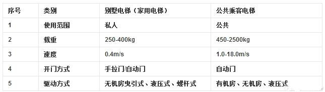 1、家用电梯与一般意义的乘客电梯的区分(见下对照表):