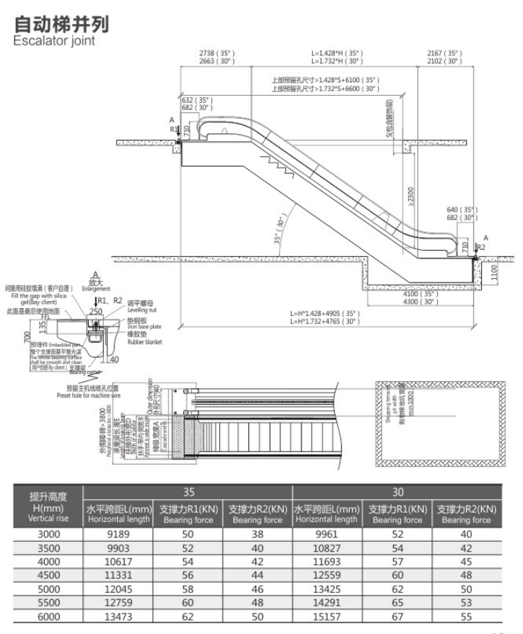 下图为自动扶手电梯并列布置安装的购物车电梯土建示意图,如有疑问可查看www.zhsldt.com更多内容或直接致电我们的技术顾问:13616720921