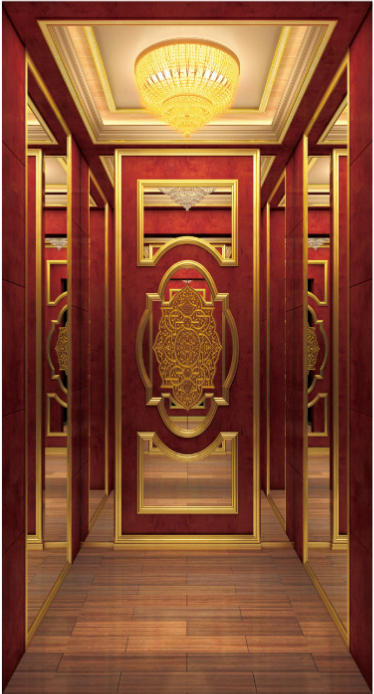 轿壁:前壁钛金镜面,两侧壁木质造型框内嵌木饰面,钛金镜面蚀刻,本色镜面