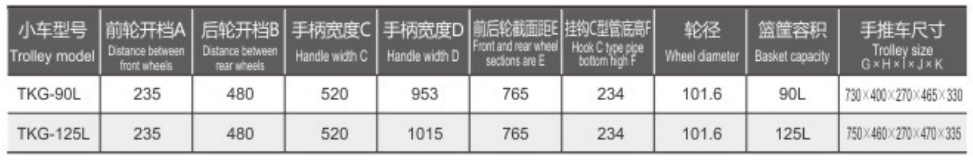 主车体框架采用高强度硬质拉钢椭圆型管材,主梁材料一次成型,整体焊接工装自动机械手焊接,篮筐采用实心圆钢整体焊接,表面底层采用镀锌处理,表面电泳或喷涂防腐处理,整车结构设计合理,符合各项安全指标,坚固耐用,90L的承载能力小于100KG,125L的承载能力小于130KG。